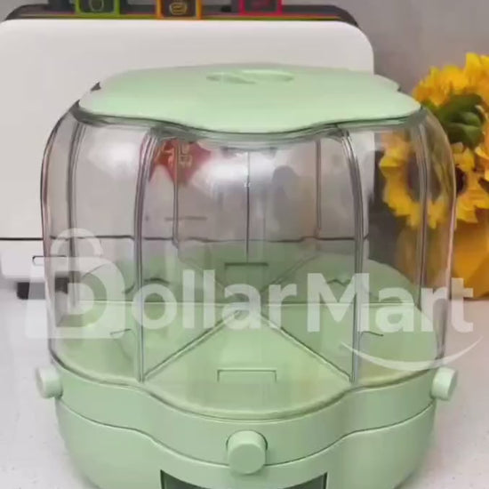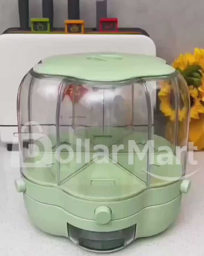 The 360° Rotating Grain Dispenser is a multi-compartment rice bucket & pulses organizer that keeps your food items fresh, tidy, and easily accessible. With its one-key press design and transparent rotating body, you can now store and dispense rice, pulses, beans, cereals, and more all in one place.